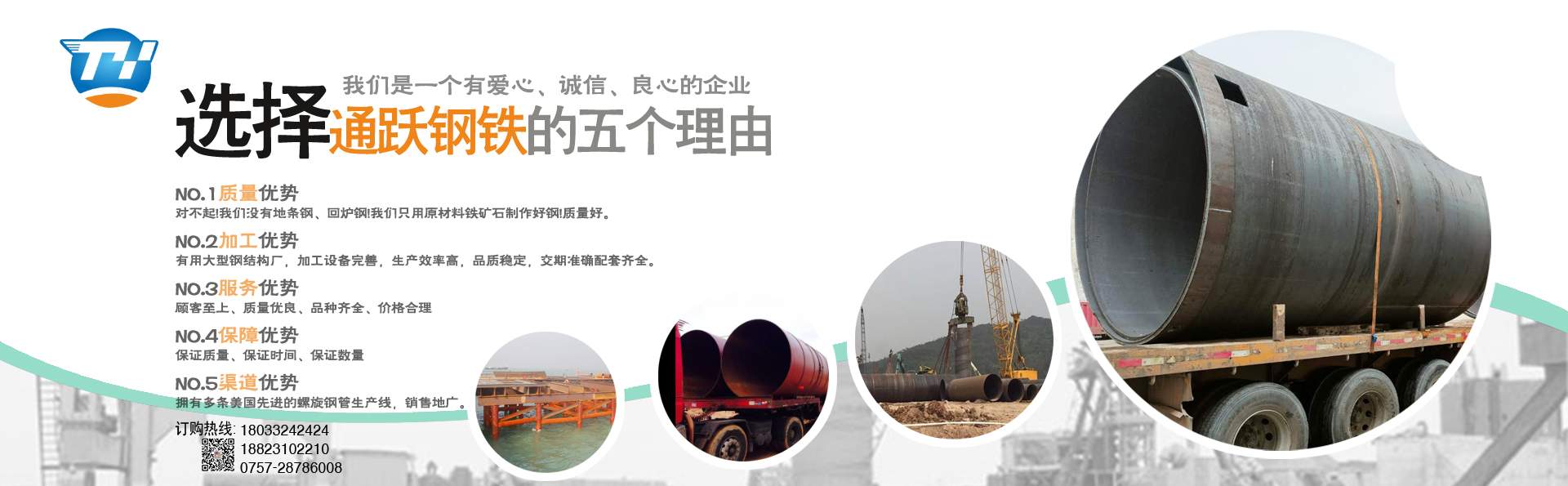 佛山市通躍鋼鐵有限公司 電話180-2228-4448 0757-28786008 擁有多條美國先進的螺旋鋼管生產線,生產直徑φ159-φ3620mm(壁厚6mm-20mm)的雙面埋弧螺旋焊鋼管,年生產能力15萬噸。 生產螺旋管 螺旋鋼管 螺旋焊管 規格厚度6mm-20mm 直徑159mm-3620mm 有多條鋼板卷管機生產規格厚度6mm-70mm 直徑400mm-5020mm 螺旋管 螺旋鋼管 鋼護筒 焊接鋼護筒 鋼板卷管 丁字焊管 加工格構柱 鋼管樁 材質Q235B Q345B Q235A 45# 20# Q420D Q390D 錳板 歡迎來電報價,公司配有大型型材 鋼板倉庫,大量各種規格現貨H型鋼 槽鋼 角鋼 工字鋼 鋼板,鍍鋅方管 鍍鋅產品 產品可以定尺定長,提供打砂,除銹,上油漆,公司配有防腐加工廠,專業對鋼管進行內外壁防腐加工,鋼管外壁主要有三油兩布,五油三布,環氧煤瀝青及環氧樹脂漆,各種高分子涂料。鋼管主要有飲用水涂料IPN8710-2B,水泥砂漿及各種環氧涂料,IPN8710飲用水防 ……了解更多